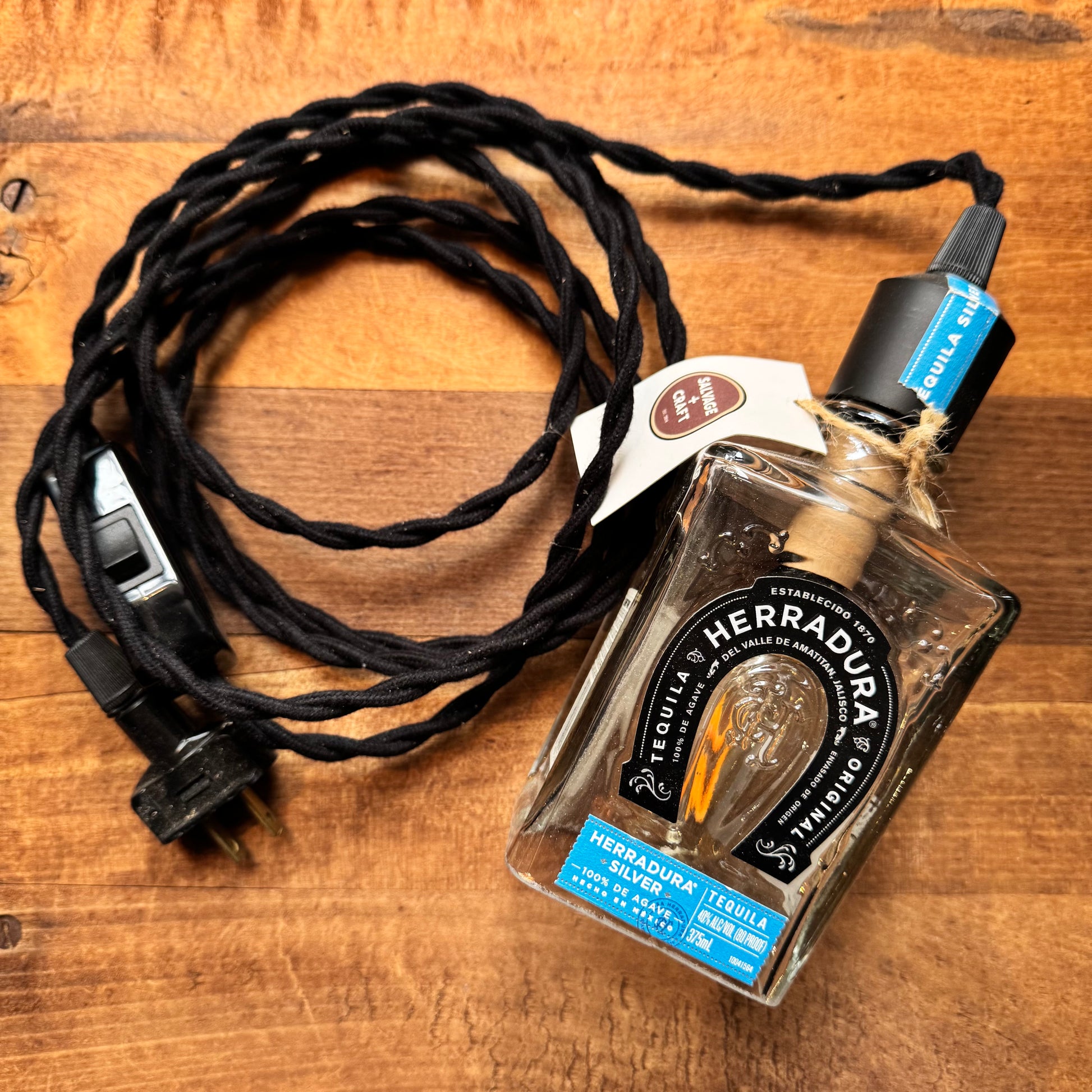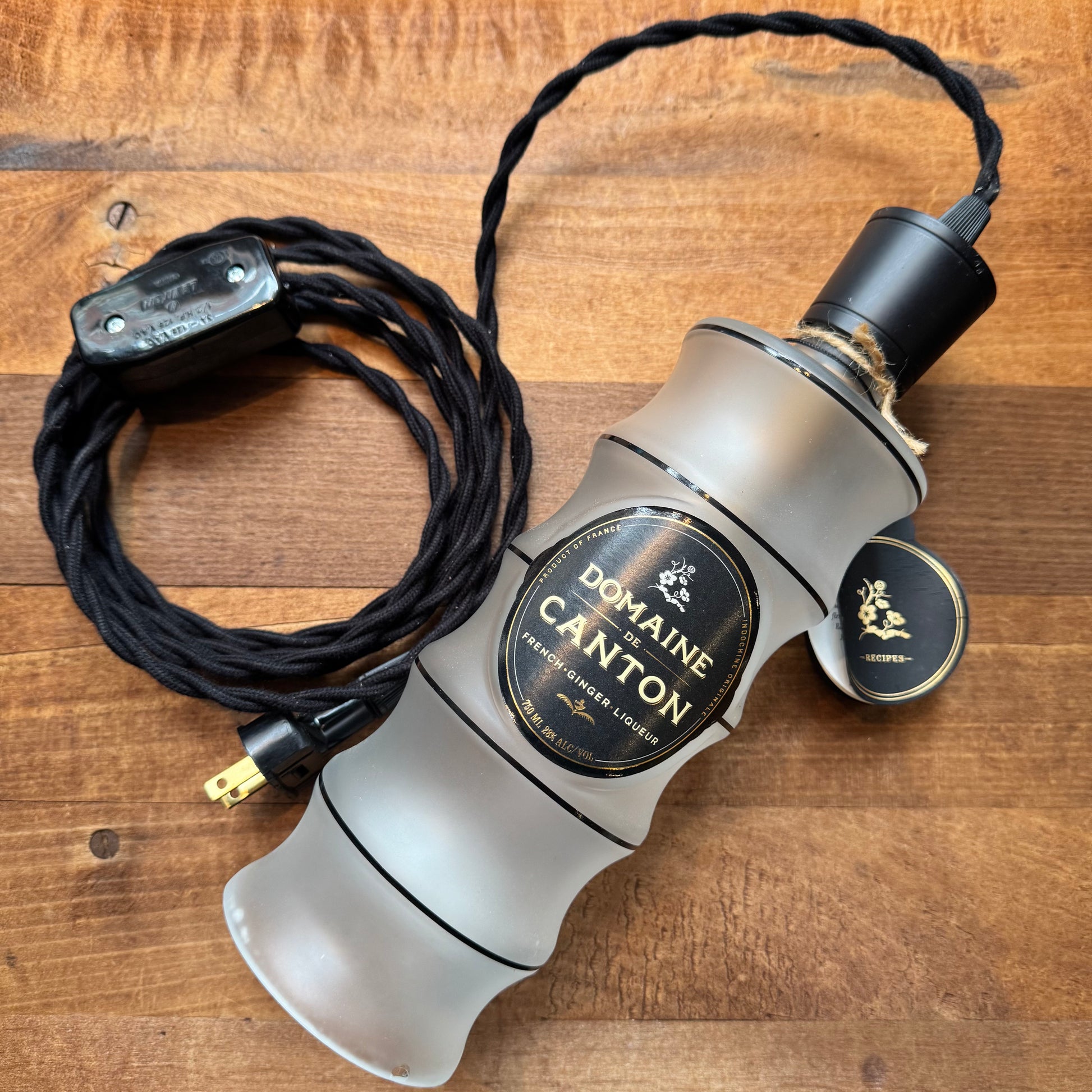 Cheers to these fun hanging liquor bottle pendant lamps. Each includes vintage-look black, brown, off-white, or red cloth covered cord with on/off switch and 25 watt Edison bulb. Cord is 8' with on/off switch located approx. 2' from 2 prong plug. Each sold separately.