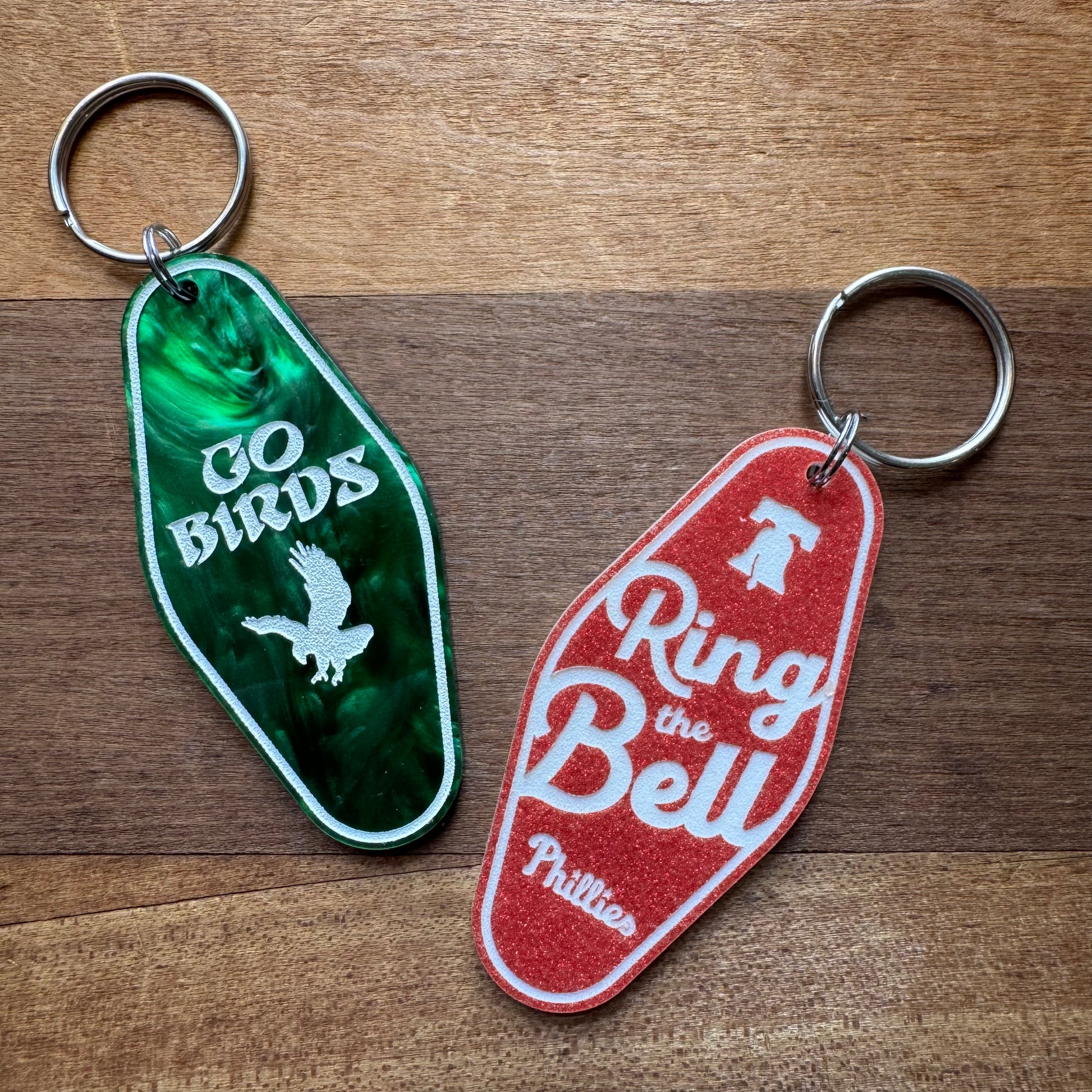 Celebrate our Super Bowl LIX champs with this Go Birds keychain in green pearl or the Fightin' Phils with this Ring the Bell Phillies keychain in red glitter and white gloss back. 3" x 1 3/8” with silver-look keyring. Each sold separately.