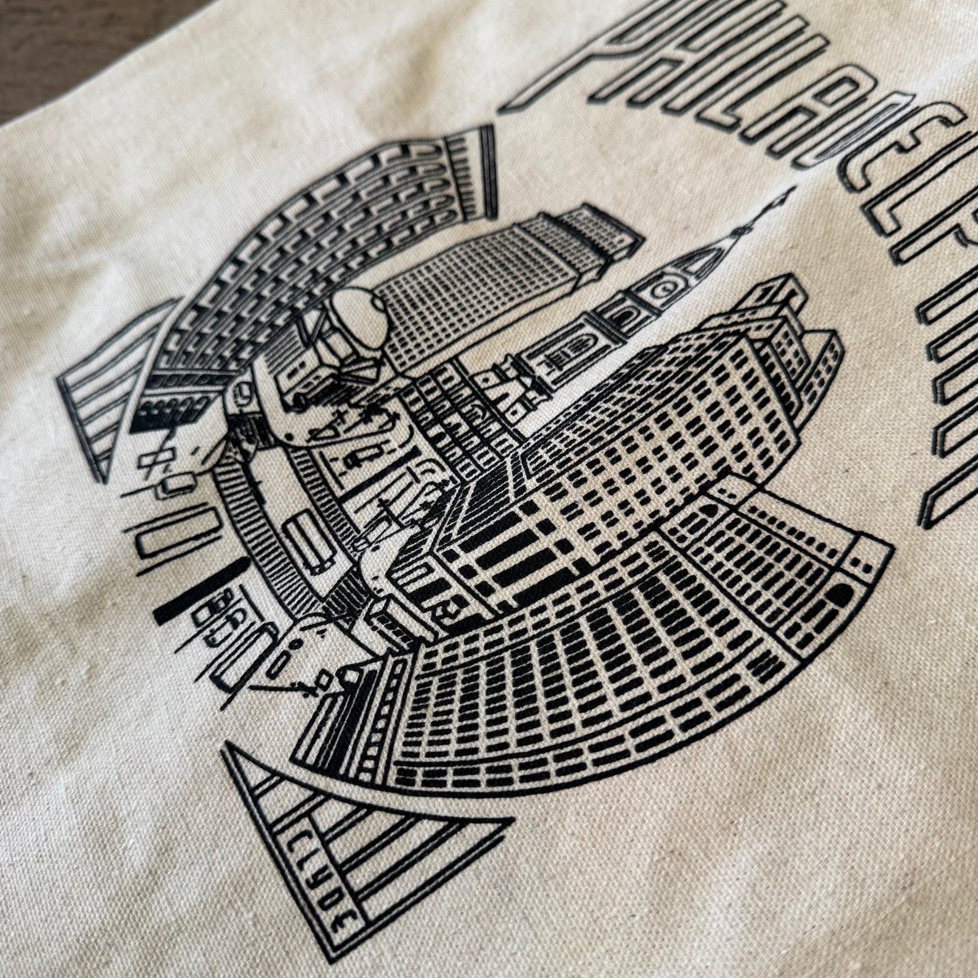This hand-screenprinted lightweight gusseted natural canvas Philadelphia skyline tote bag features a fish-eye view of City Hall looking down S. Broad Street! Printed in black ink. 15" H x 15" W, 10" handle length, 5" gussets.