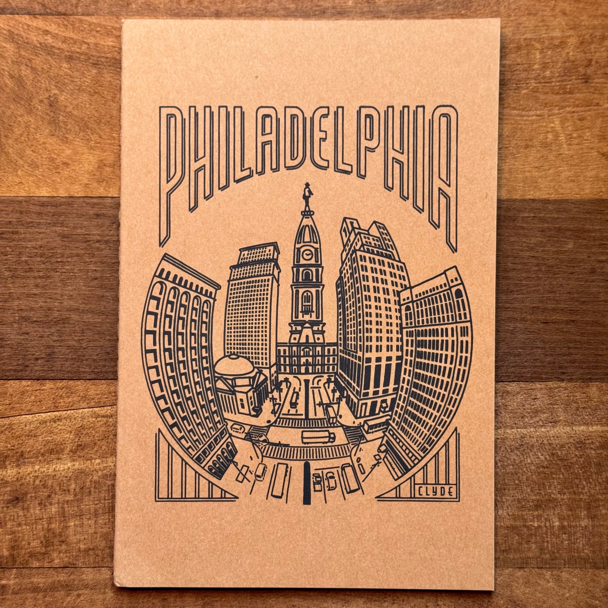 These hand-screenprinted Philly notebooks will make you the cool kid on the campus of life! Choose from Rocky and Philadelphia Skyline designs. Dark grey ink on light brown cover, A5 size, 8 1/4" x 5 1/2", lined, 60 pages, stitch bound. Each sold separately.