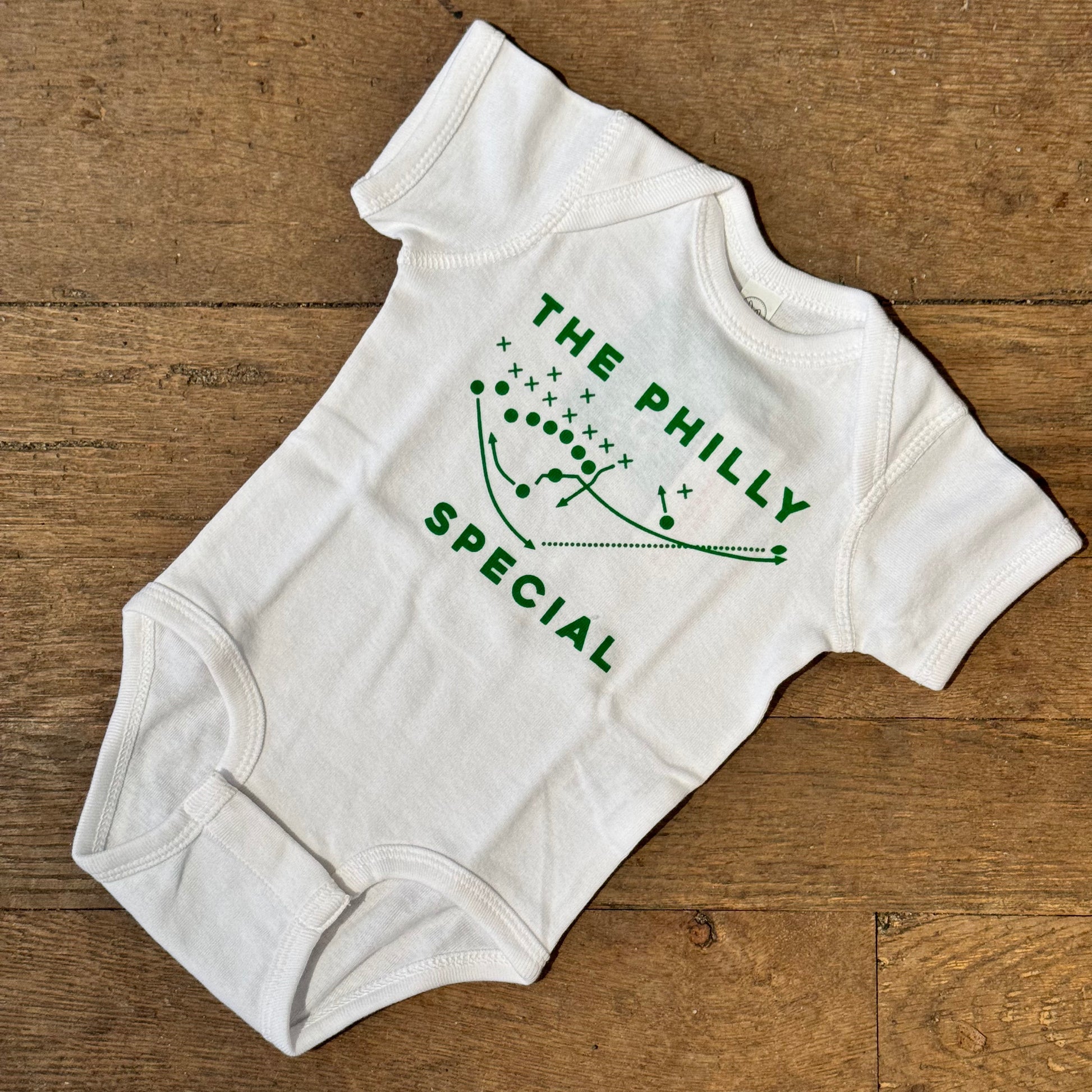 The Ultimate Philly Special! Relive the Nick Foles' Play of the Century over and over in this Super Bowl-inspired baby onesie! 100% cotton. Available in 6 or 12 months sizes in kelly green ink on white onesie.