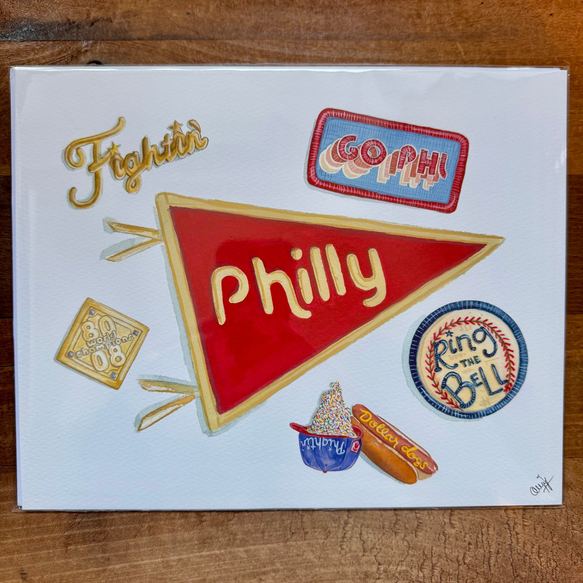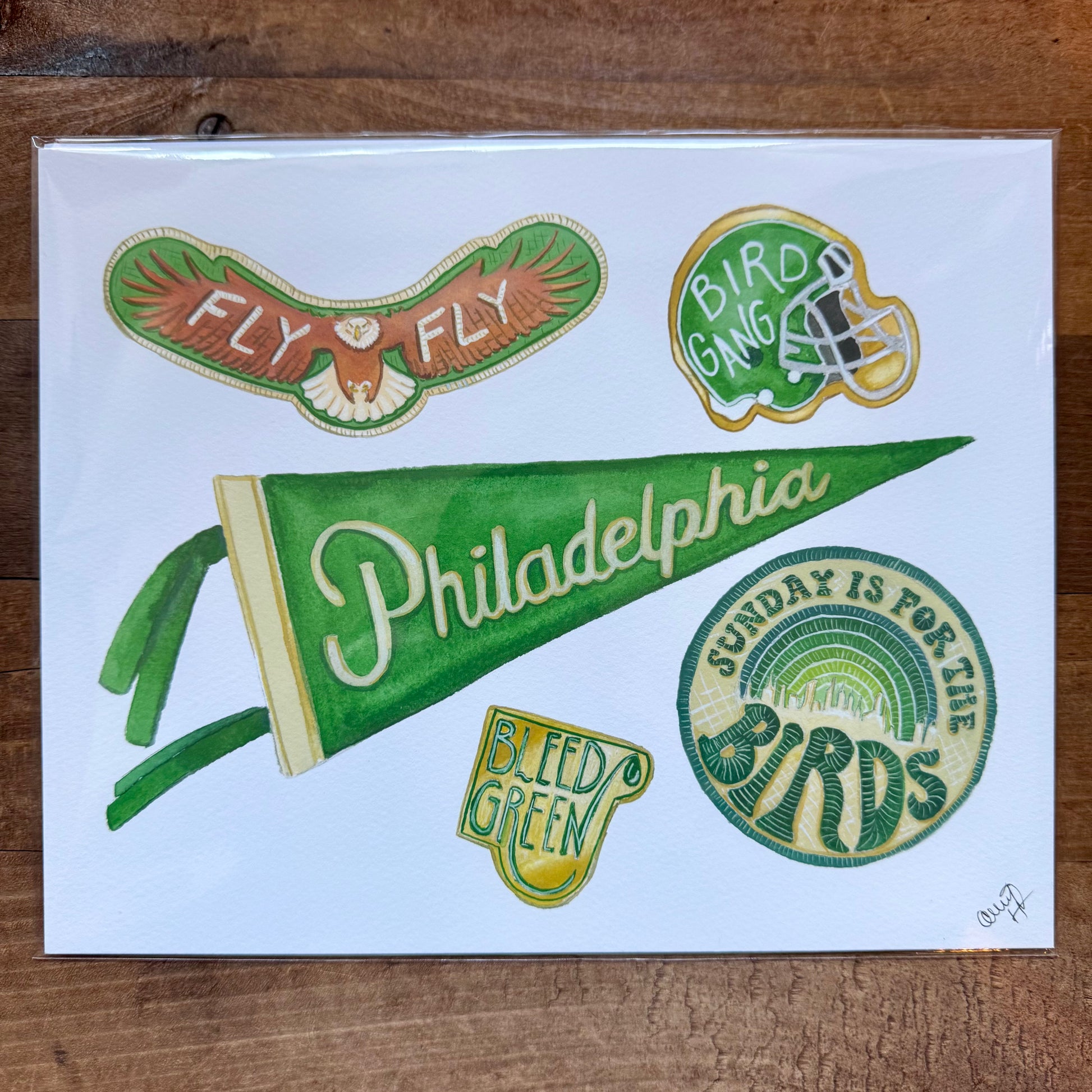 These fun watercolor prints will certainly score with any Philly sports fan! Painted to look like pins, patches, and pennants. Prints are printed on a fine art paper - acid free base, white, textured matte, 19 mil. Hand signed in the bottom right corner. Choose between the Eagles or Phillies designs. 8”x10”. Each sold separately.